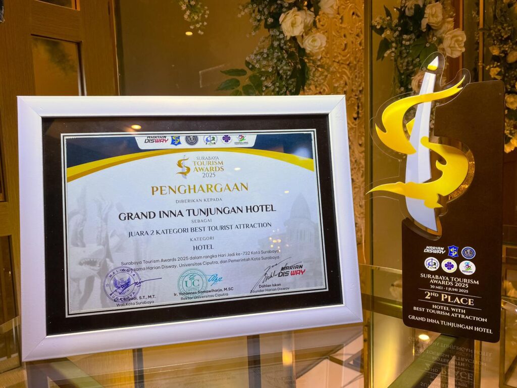 Salah satu pencapaian membanggakan datang dari Grand Inna Tunjungan, yang berhasil meraih penghargaan sebagai “Best Tourist Attraction” dalam Surabaya Tourism Award 2025. Penganugerahan ini berlangsung di Linear & Oval Atrium, Ciputra World Mall pada 1 Juni 2025 yang di wakili oleh Food Beverage Manager, Yudi Firmansyah
